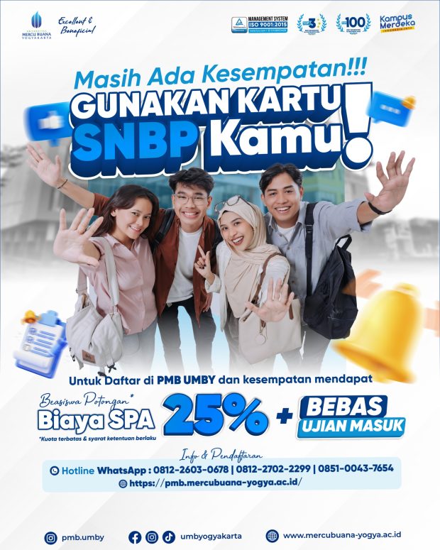 Gunakan kartu SNBP-mu untuk daftar di PMB UMBY dan raih kesempatan Beasiswa Potongan SPA 25% ???? (Kuota terbatas & S&K berlaku).